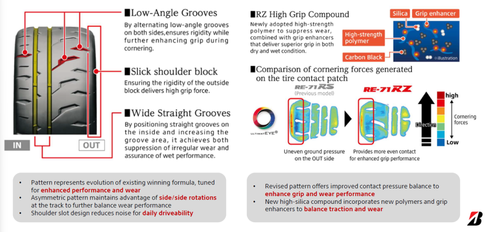 The net effect is a compound that Bridgestone says delivers superior grip in both dry and wet conditions while simultaneously suppressing wear. This is enabled by Bridgestone’s next-generation ENLITEN technology, described as incorporating advanced compounds for wear optimisation and long-lasting performance. The specific ENLITEN attributes vary by tire product, but for the RE-71RZ the focus is clearly on extending the grip-versus-wear trade-off curve outward-more of both, rather than sacrificing one for the other.