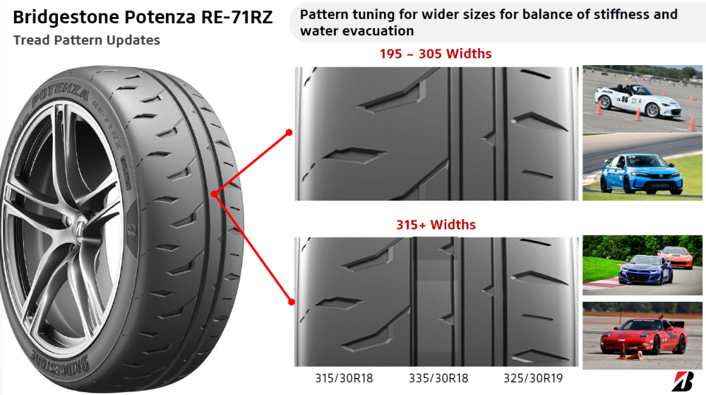 Bridgestone has also introduced pattern tuning that varies by section width. Sizes from 195 to 305 mm use the standard pattern geometry, while widths of 315 mm and above (315/30R18, 335/30R18, 325/30R19) receive a modified pattern optimised for the balance of tread stiffness and water evacuation at those wider footprints. This is a noteworthy detail for Corvette, 911 and other wide-rear-tire fitments where a one-size-fits-all pattern can compromise either grip or wet safety.